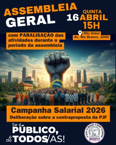 O SINSERPU-JF iniciou, na tarde desta segunda-feira (13 de abril), uma intensa mobilização direta nos locais de trabalho para convocar os servidores municipais para a Assembleia Geral Extraordinária da Campanha Salarial 2026. A atividade, que ocorrerá na próxima quinta-feira (16 de abril), [...]