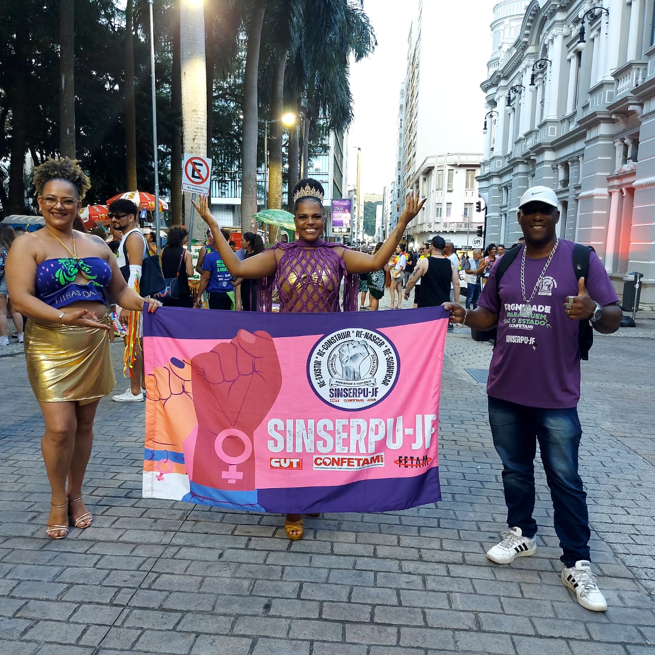 “Pela primeira vez participei do bloco Filhas da Luta, representando o SINSERPU-JF. O Bloco estava lindo e muito animado, trazendo a energia contagiante do carnaval. Mas, além da festa, conseguimos levar para a sociedade uma mensagem importante: a luta das feministas por respeito, igualdade de gênero e todas as pautas que envolvem os direitos das mulheres. Foi um momento de celebração, resistência e reafirmação das nossas conquistas e desafios”, registrou a vice-presidente do SINSERPU-JF.