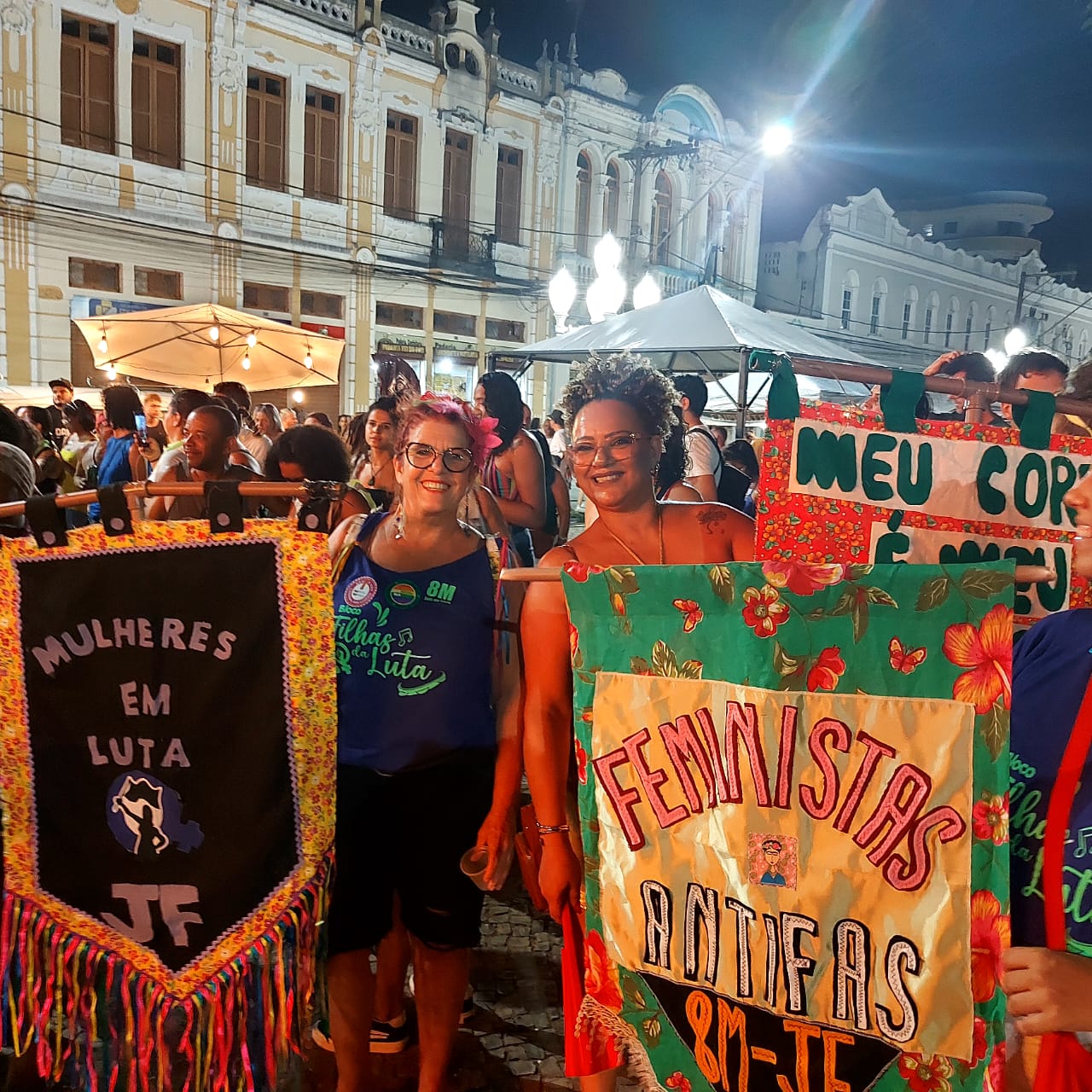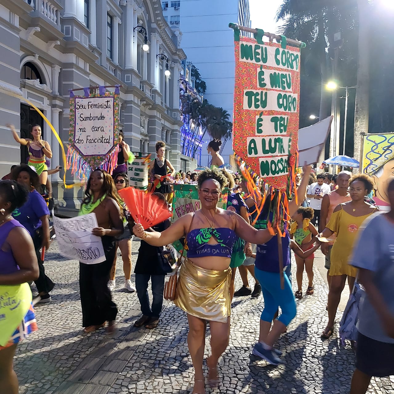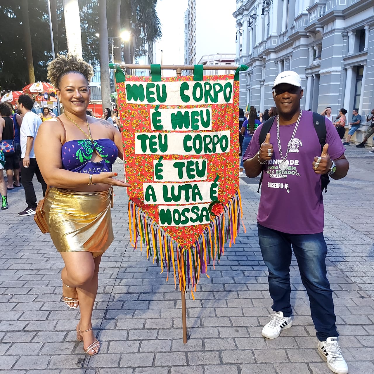 O SINSERPU-JF – através da vice-presidente, Lucilea Pereira, e do diretor Social, Raça e Gênero, Adenilson Reginaldo “Zé Neguinho” – participou do desfile do Bloco “Filhas da Luta”, organizado pelo coletivo feminista – 8M Juiz de Fora, na tarde/noite desta quinta-feira (20 de fevereiro). Elas desfilaram, no Circuito Parque Halfeld – Praça da Estação com o enredo “Meu corpo é meu! Teu corpo é teu! A luta é nossa!”, exigindo respeito e o direito de festejar, sem ser importunadas.
