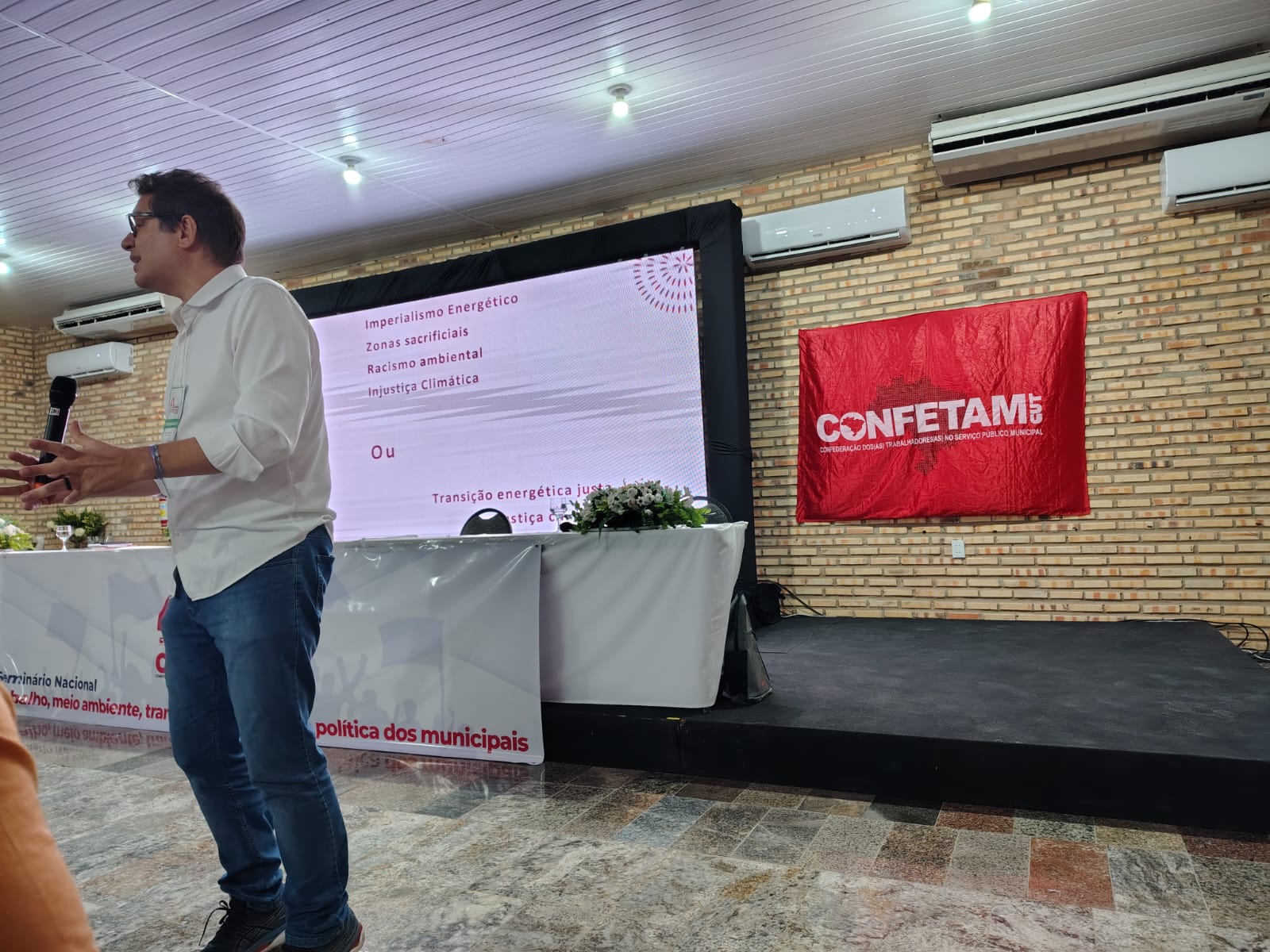 A presidenta do SINSERPU-JF, Deise Medeiros, e a conselheira fiscal do Sindicato, Vera Lúcia Daniel, participaram, na tarde desta quarta-feira (9 de abril), do Seminário “Trabalho, meio ambiente, transição justa e a ação política dos municipais” – parte do 4º Congresso da CONFETAM/CUT, que será aberto oficialmente às 20h desta quarta-feira. “Um tema extremamente importante na concepção dos municipais, que teve uma enorme contribuição dos palestrantes Renato Roseno (deputado estadual do PSOL) e João Cayres (secretário regional da ISP no Brasil)”, observou Deise Medeiros.