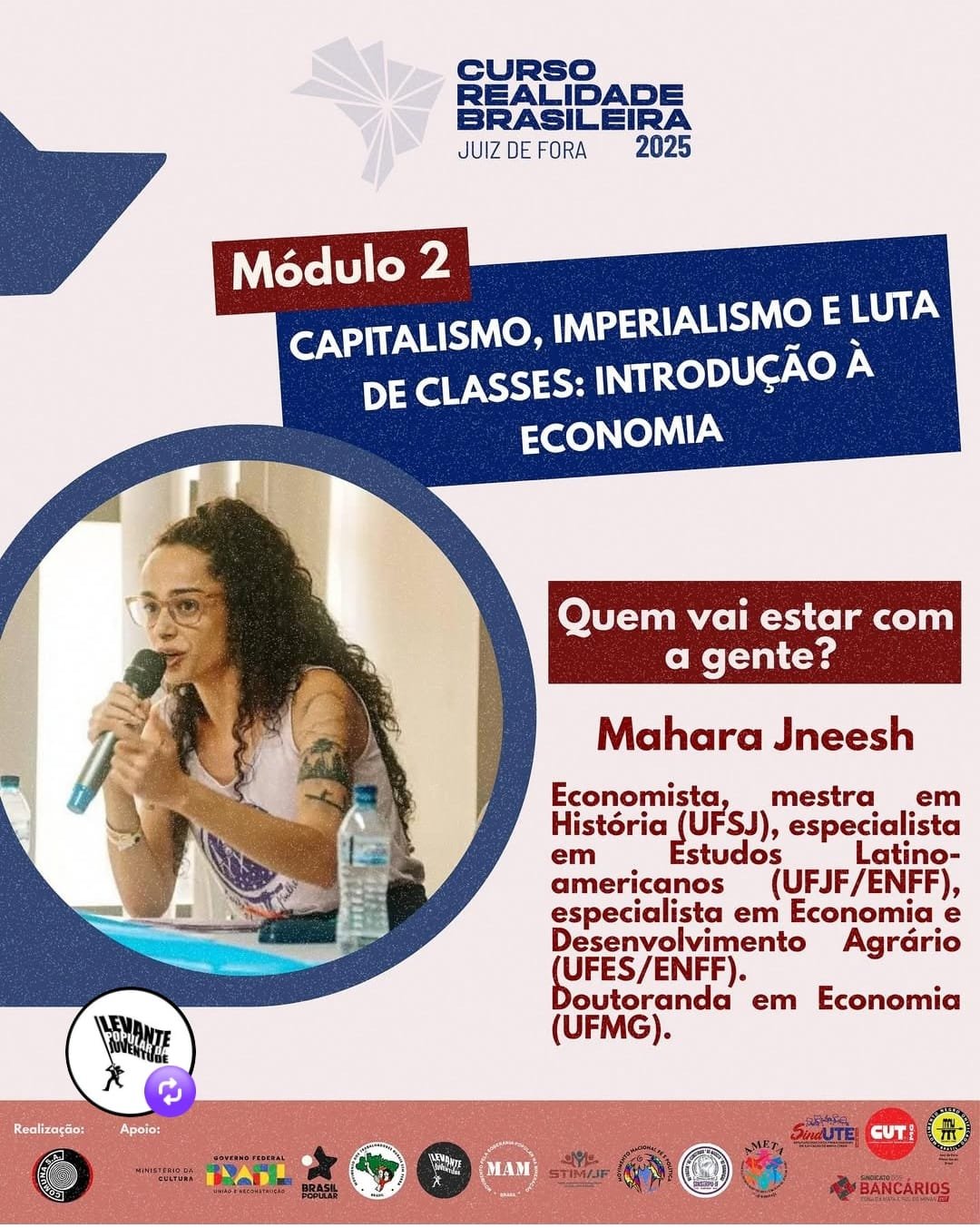 O tema deste Módulo 2 é “Capitalismo, Imperialismo e Luta de Classes: Introdução à Economia”, e será conduzido por Mahara Jneesh, dona de um extenso currículo: economista, mestra em História (UFSJ), especialista em Estudos Latino-americanos (UFJF/ENFF) e em Economia e Desenvolvimento Agrário (UFES/ENFF), doutoranda em Economia (UFMG) e comprometida com os estudos e militância nos temas da economia feminista e feminismo popular, na luta pela transformação social.