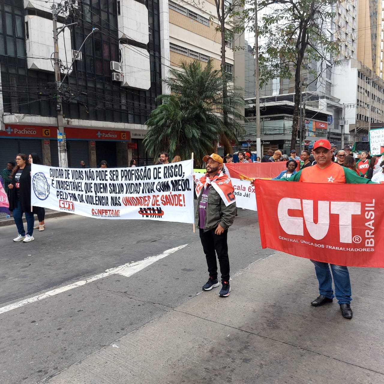 Participante contumaz, e esperado, do tradicional “Grito dos Excluídos”, o SINSERPU-JF “assinou embaixo” nas pautas gerais do evento (pela soberania do país, diante dos ataques descabidos do presidente do Estados Unidos Donald Trump – “Quem manda no Brasil é o povo brasileiro”, e pelo fim da escala de trabalho 6 x 1 – “Redução da jornada de trabalho já”), mas levou às ruas, na manhã deste domingo (7 de setembro), as demandas específicas dos servidores públicos municipais de Juiz de Fora: Pela aprovação do Projeto de Lei (PL) 4146/2020, que institui um piso salarial para os garis (“uma questão de justiça e valorização, não de custo”), a defesa do PAS-JF (o Plano de Saúde do servidor, em processo de “desmonte”) e pelo fim da violência nas unidades de saúde (“Cuidar de vidas não pode ser uma profissão de risco; é inaceitável que quem salva vidas viva com medo”).