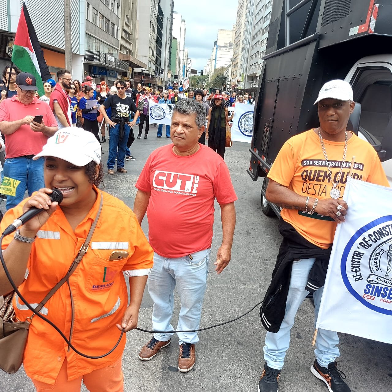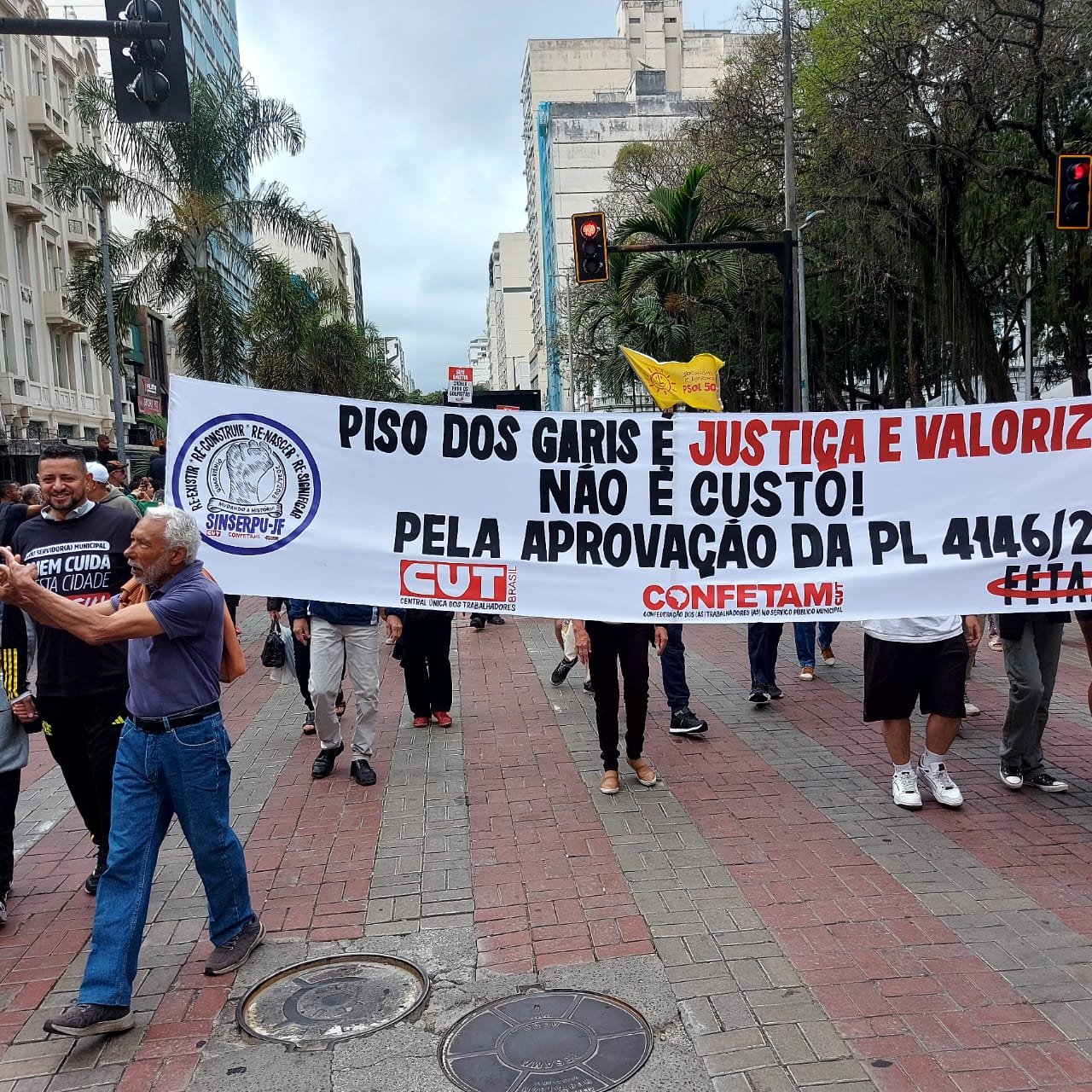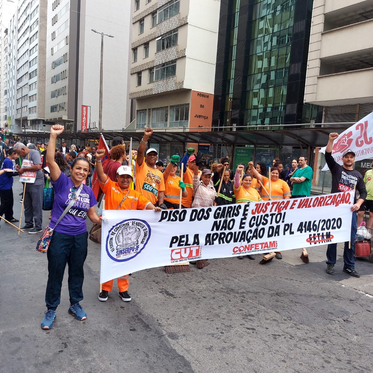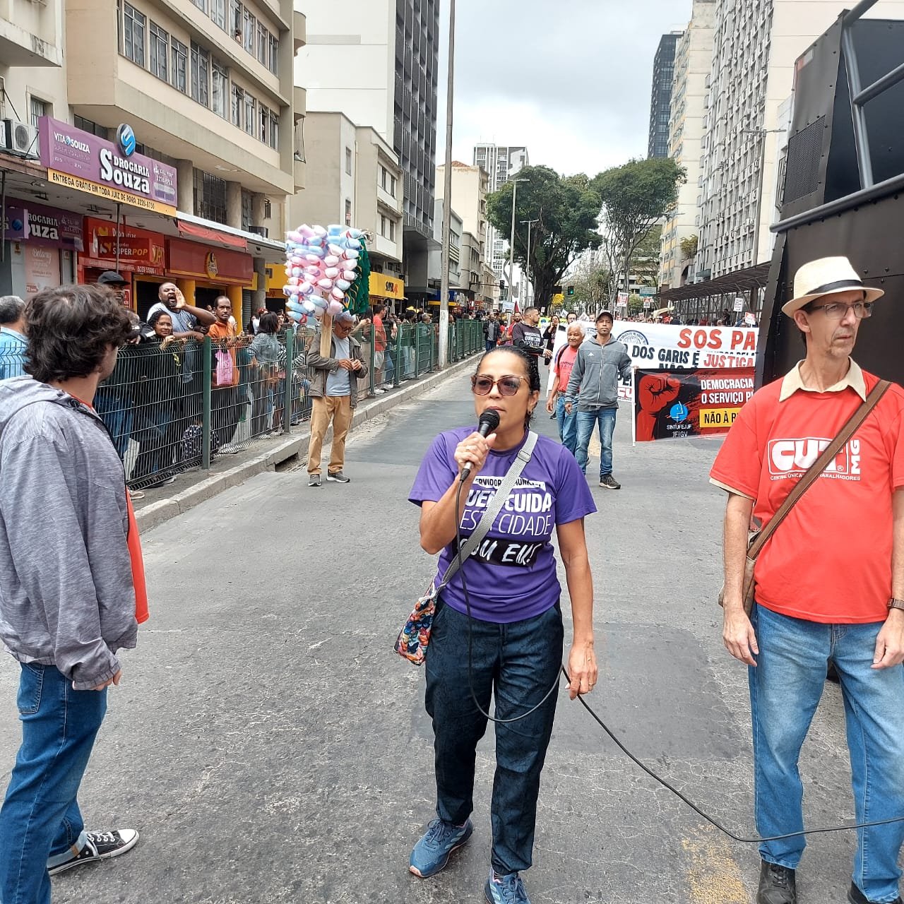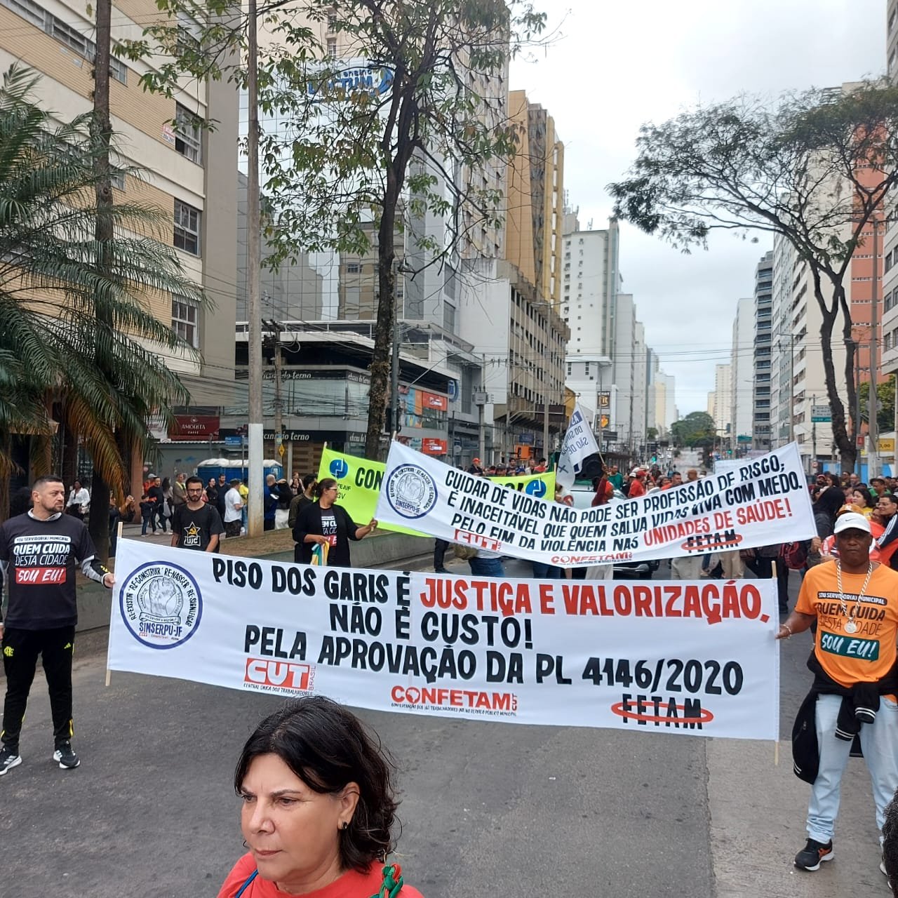 E o SINSERPU-JF foi bastante enfático na defesa das causas, indo além das faixas e discursos. A presidenta do Sindicato, Deise Medeiros, lembrou que além do piso salarial, o PL 4146, em tramitação na Câmara Federal, regulamenta a profissão de Trabalhador Essencial de Limpeza Urbana, com um limite de 36 horas semanais de jornada, com possibilidades de adicional de insalubridade, aposentadoria especial e benefícios adicionais, como o vale-alimentação; e que a defesa do PAS-JF, por sua vez, é, a rigor, pela manutenção do direito de usufruir de um Plano de Saúde que existe há 22 anos.