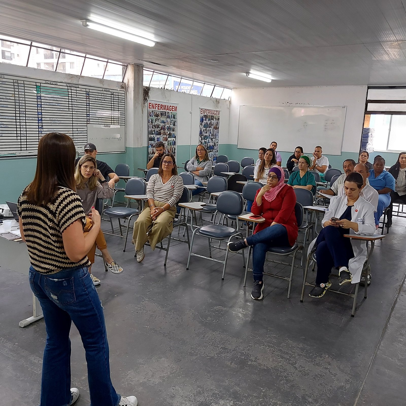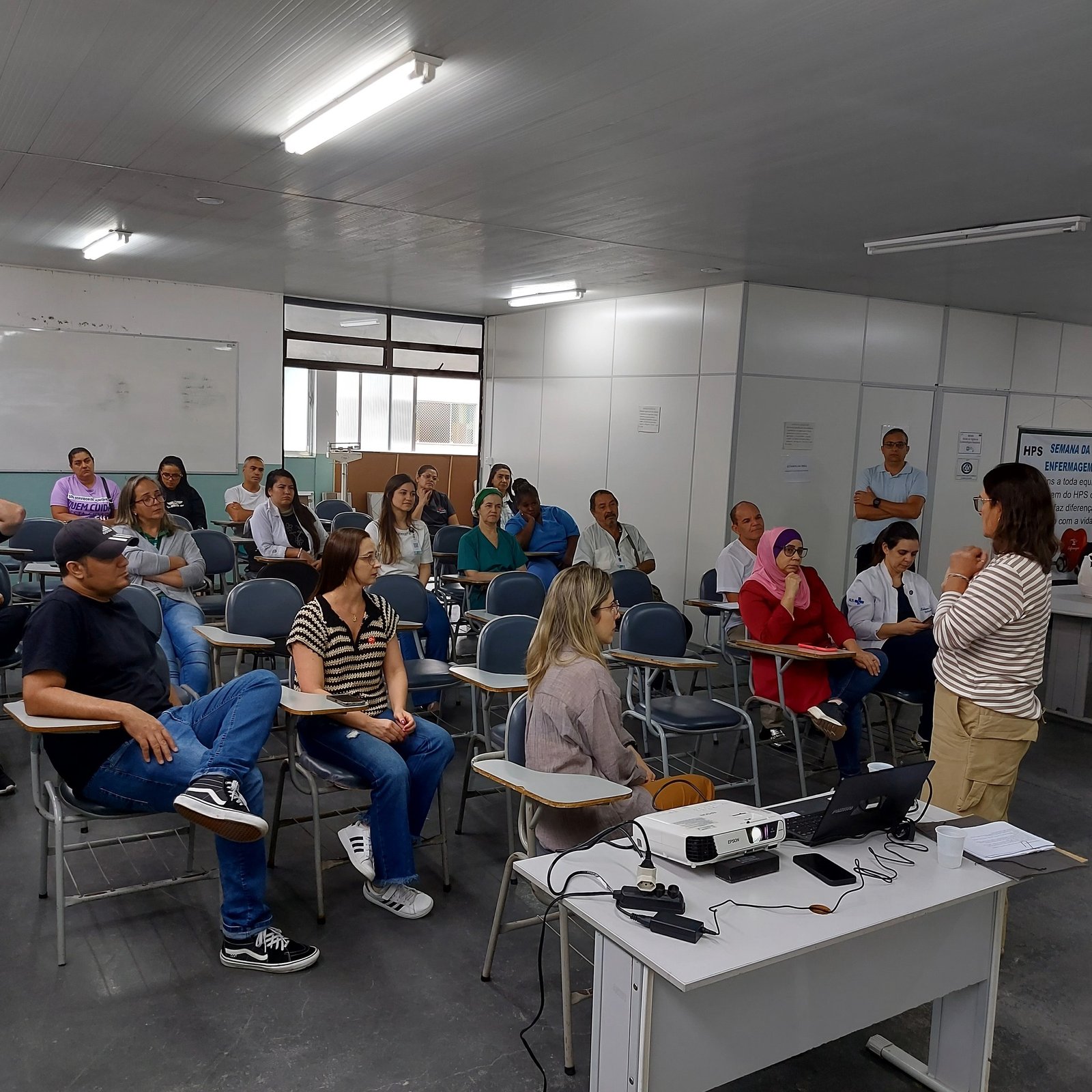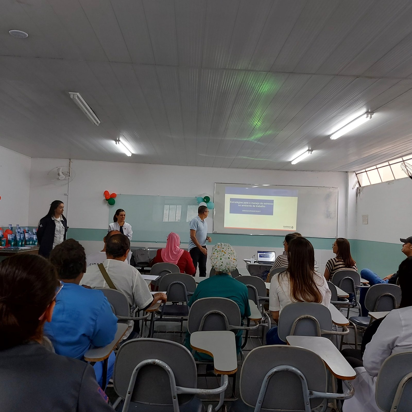 Os diretores do SINSERPU-JF Anderson Luís Gonçalves “Andinho” (Saúde), Denise Medeiros (Administrativa) e Rosângela Dias (Base) voltaram ao Centro de Estudos do HPS (Hospital de Pronto Socorro Dr. Mozart Teixeira), na tarde desta quarta-feira (24 de setembro), para o segundo dia da SIPAT (Semana Interna de Prevenção a Acidentes de Trabalho). A palestra do dia, “Estratégia e Manejo do Estresse no Cotidiano do Trabalho”, ficou a cargo da dupla da Cassiana Prado Coutinho, psicóloga, e Ludmila Pacheco Lopes, assistente social, do DGP/Departamento de Gestão de Pessoas da Secretaria Municipal de Recursos Humanos.