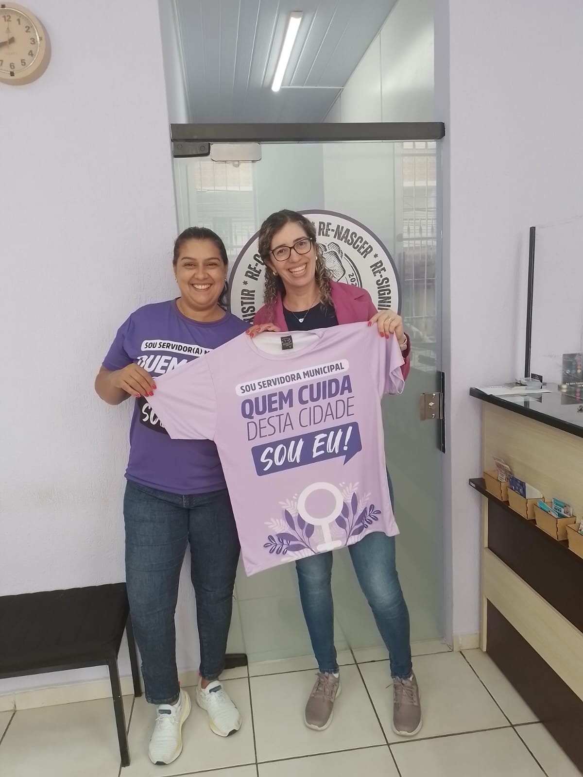 A cor lilás foi a escolhida pela servidora Emily Miranda Louzada que recebeu a sua camisa das mãos da diretora de base Rosangela Silva (foto 4).