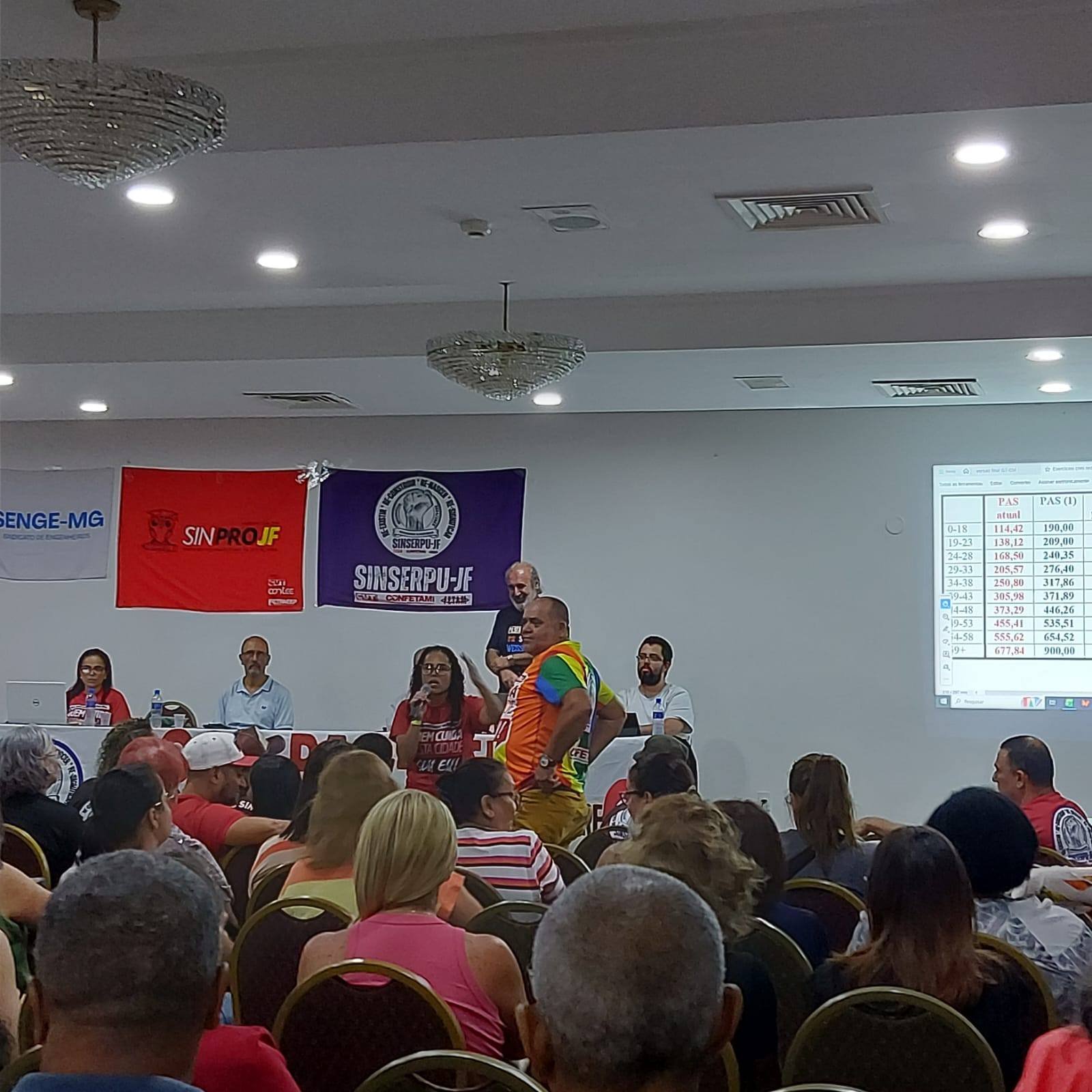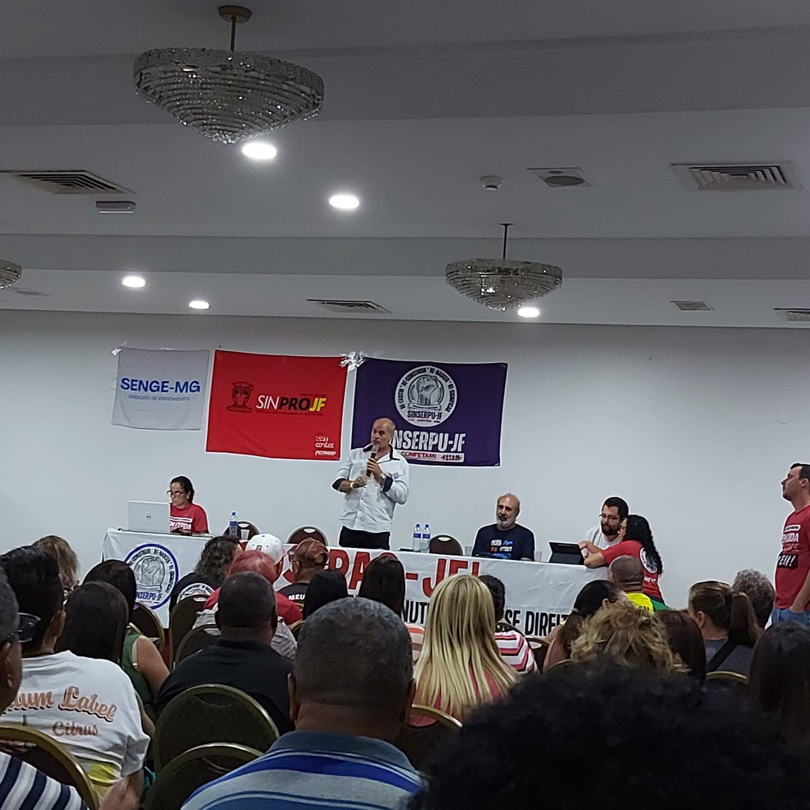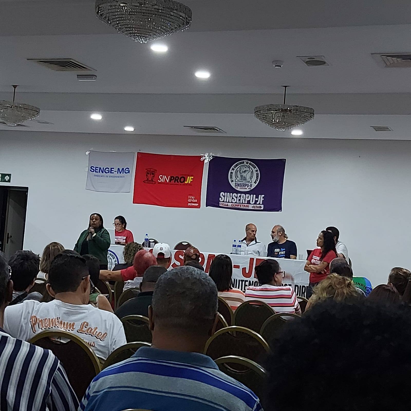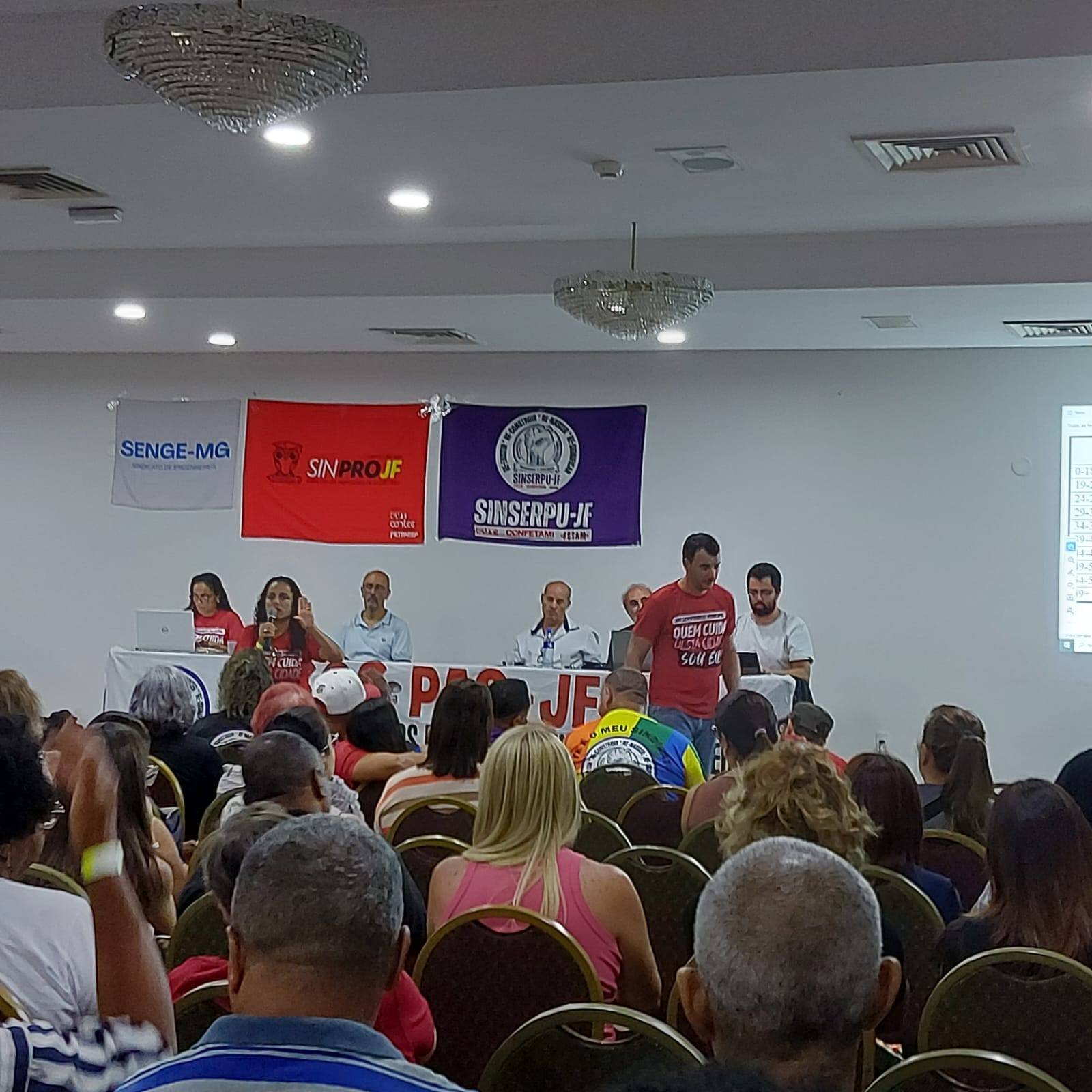 Na Assembleia de hoje, convocada pela União dos Sindicatos (SINSERPU-JF, SENGE, SINAGUA, SINPRO-JF e S