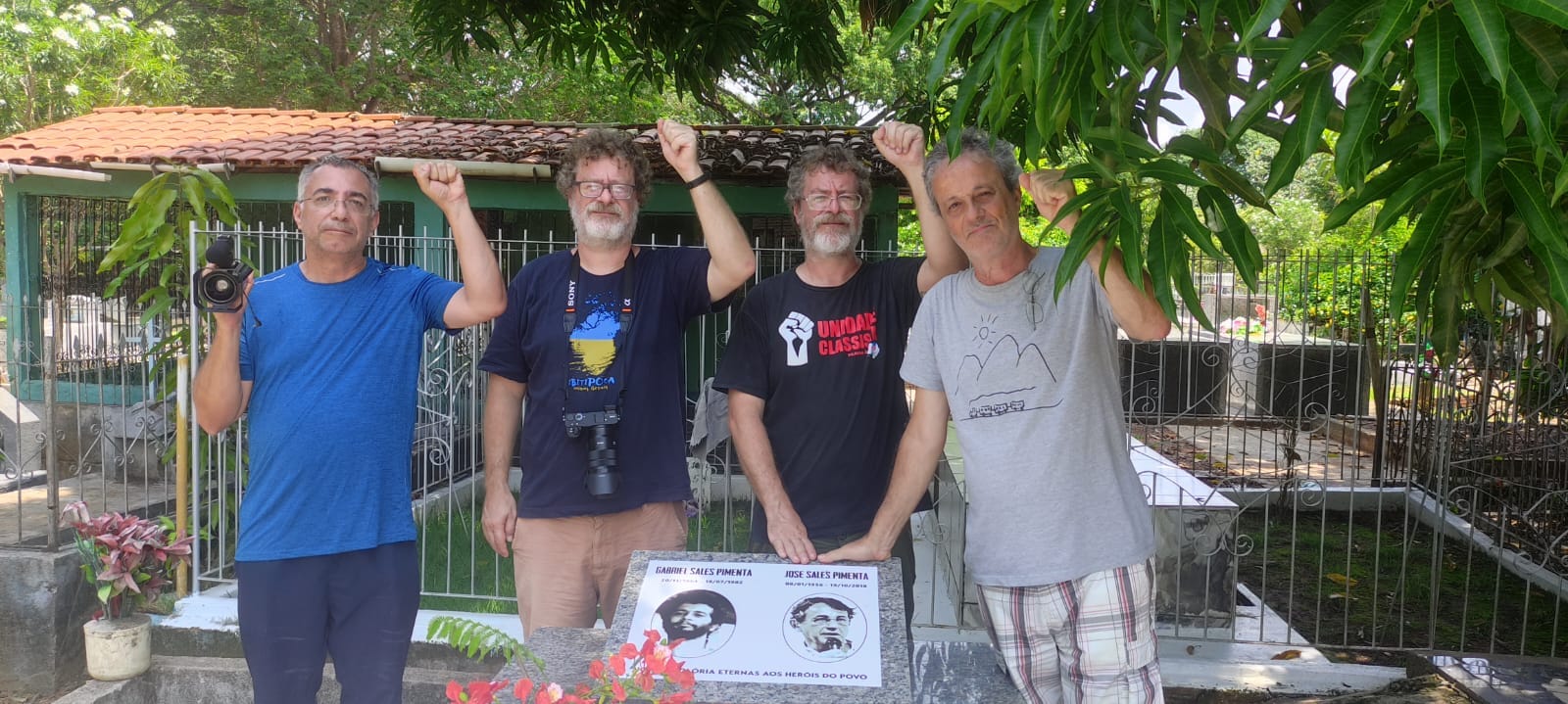 Na última foto, da esquerda para a direita, Américo Galvão, Rubens Ragone, Luiz Carlos Torres Martins Júnior “Kaizim” (conselheiro fiscal do SINSERPU-JF) e Rafael Pimenta (irmão de Gabriel), em Marabá, no túmulo de Gabriel e de seu irmão, José “Zé” Sales Pimenta (“também grande lutador do povo brasileiro”, nas palavras de Kaizim), nas filmagens do documentário sobre Gabriel, que deverá ser lançado no ano que vem.
