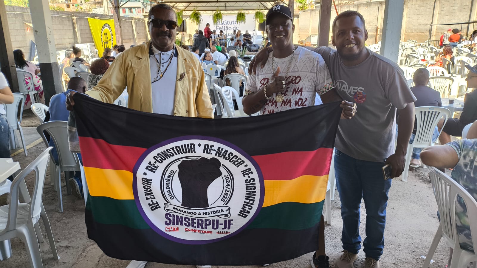 No sábado, 12/07, o diretor responsável pela pasta Social, Raça e Gênero, Adenilson Reginaldo “Zé Neguinho”, ao lado do diretor de base Luciano Ferreira da Cruz, representou o sindicato na 1ª Feijoada Solidária, realizada no Sport Club Juiz de Fora. O evento contou com o desfile das candidatas negras à Musa Plus Size 2025. Já no domingo, 13 de julho, Adenilson esteve presente na 22ª edição do Feijão de Ogun, promovida pelo Movimento Negro Unificado (MNU) na Quadra União das Cores, no Bairro Milho Branco. Com o tema “Gênero, raça e sexualidade — a resistência dos corpos negros”, o evento de cunho festivo e religioso (em homenagem ao orixá Ogun) ofereceu, uma programação diversa na semana passada, abordando questões raciais e de consciência negra.