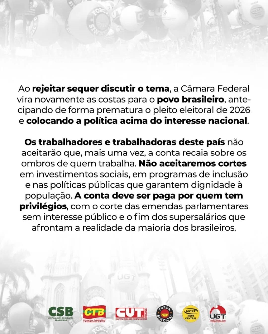 O SINSERPU-JF APOIA O REPÚDIO DAS CENTRAIS SINDICAIS à decisão da Câmara de Deputados de não apreciar a Medida Provisória (1303/2025) que previa a taxação dos bancos, das bets e dos bilionários.