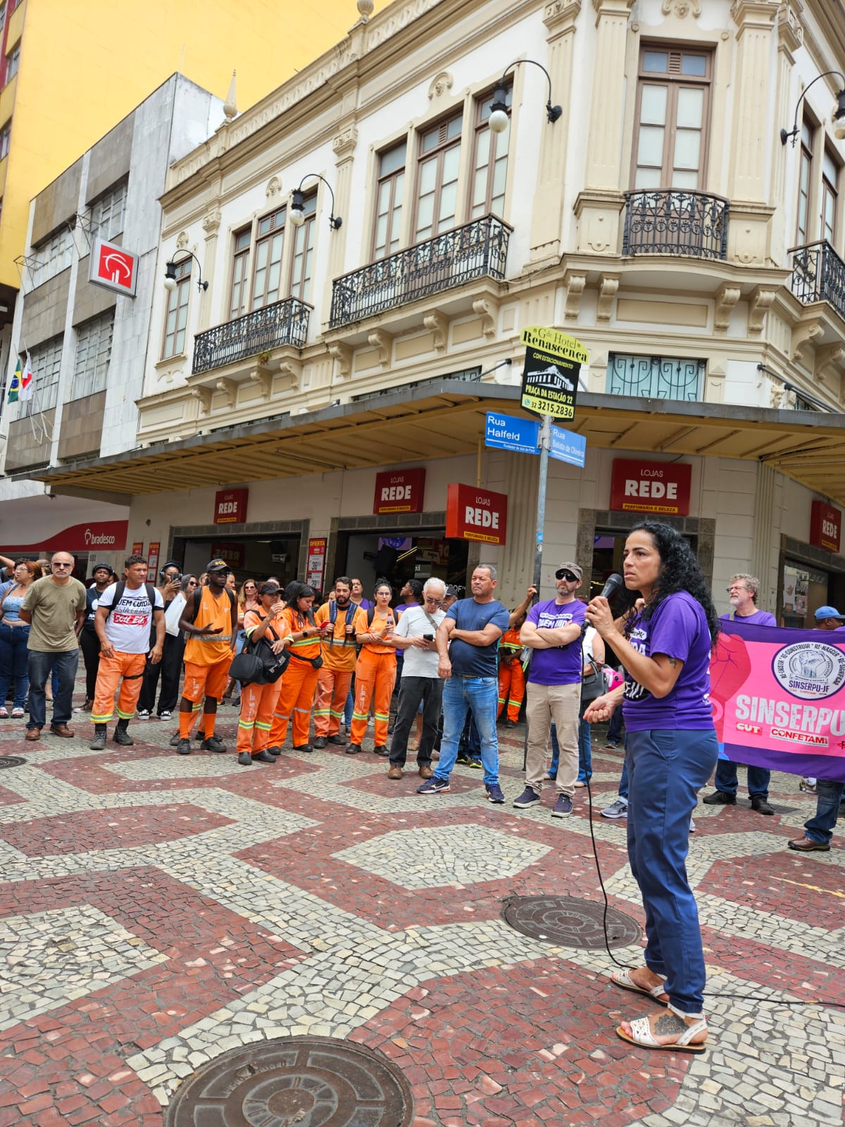 A presidente do SINSERPU-JF Deise Medeiros denunciou veementemente o assédio sofrido por servidores do Demlurb, coagidos a não exercerem seu direito legal de participar da assembleia. “Isso é inaceitável. Temos o direito de lutar pelo que é nosso”, afirmou. Ela também destacou a importância das eleições do JFPREV e o perigo que a PEC 38 representa para o funcionalismo público.