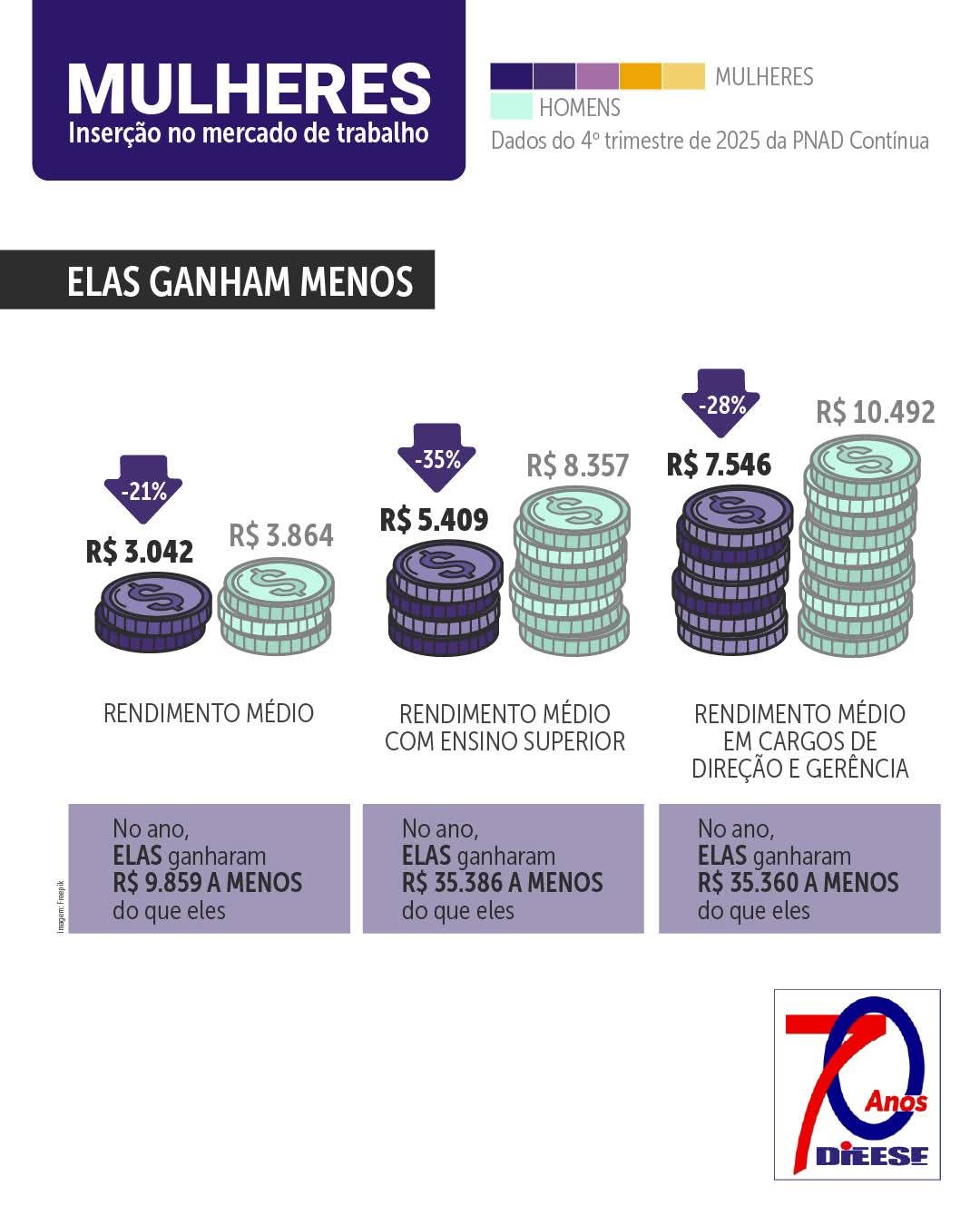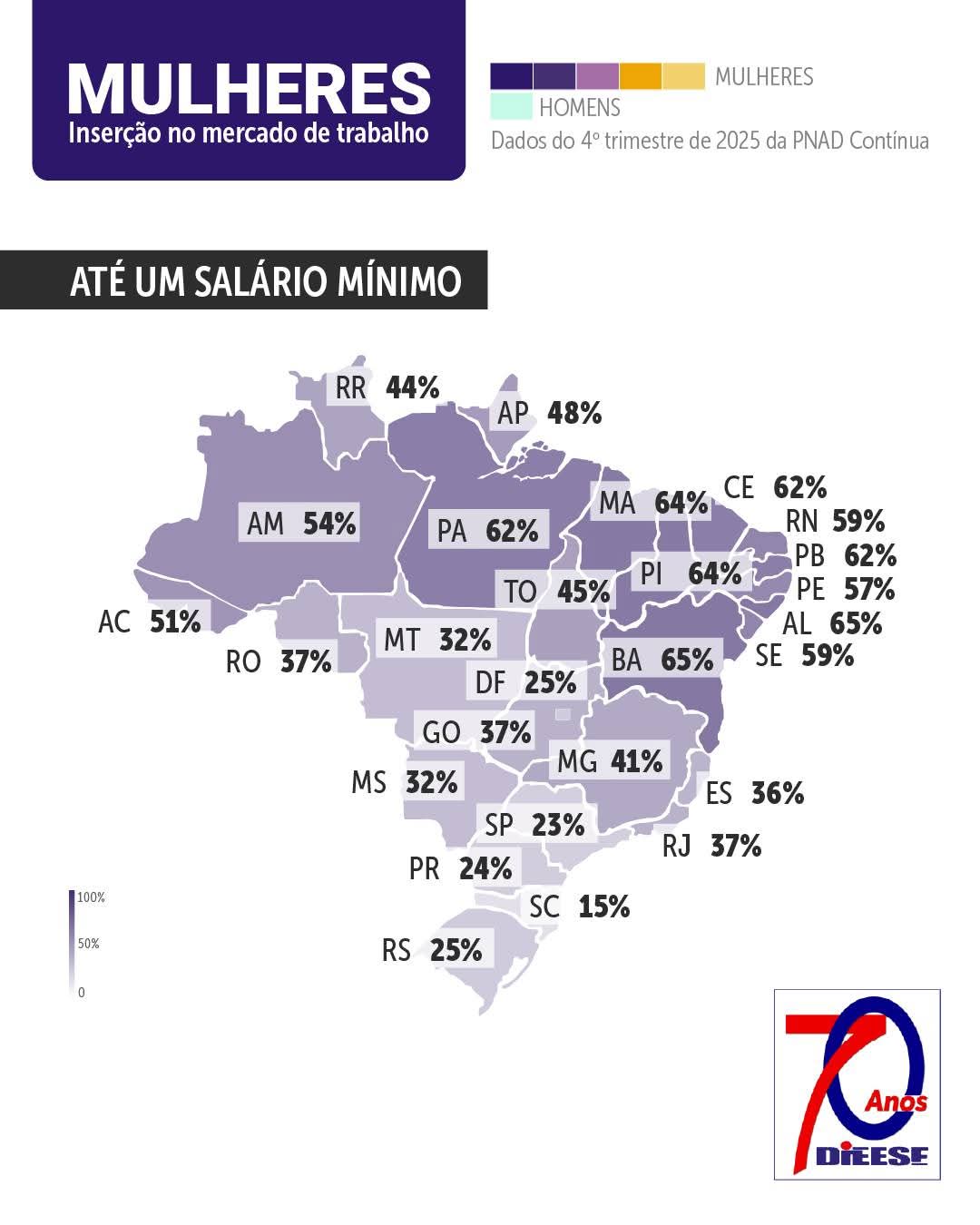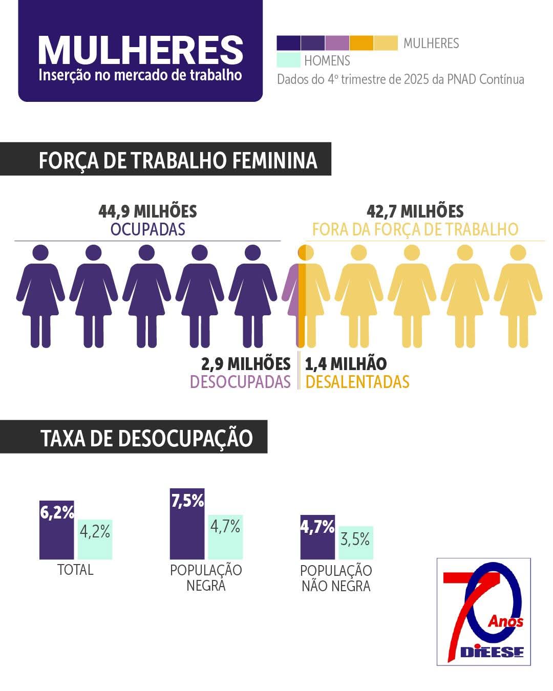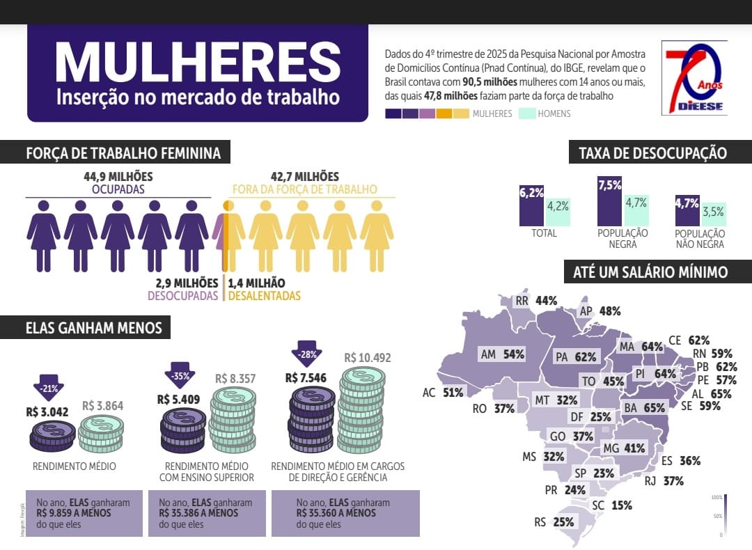 Paralelamente, a desigualdade de gênero persiste no mercado de trabalho: as mulheres ganham 21% menos que os homens, diferença de quase R$ 10 mil anuais. Mulheres negras são maioria no trabalho doméstico (14,5%) e na informalidade (39,9%). Nos cargos de chefia, a proporção é de uma negra a cada 47 trabalhadoras, ante um homem não negro a cada 18.